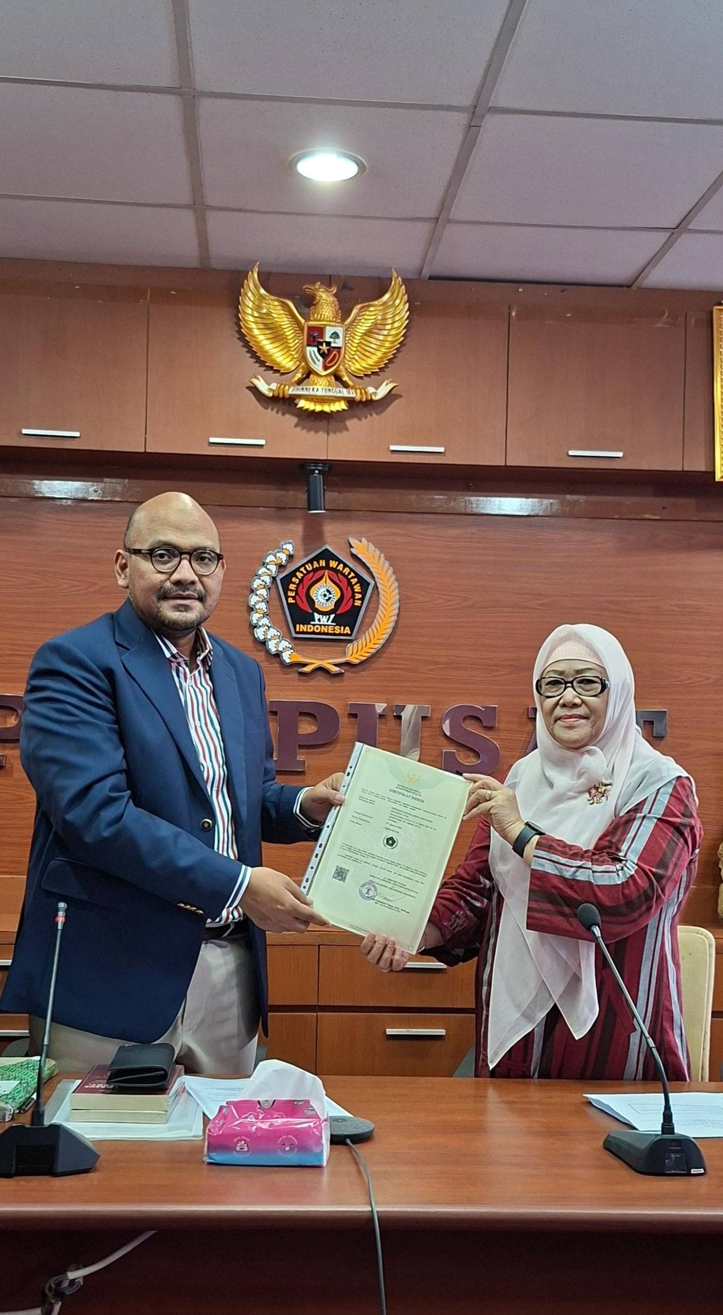 Ketua Umum IKWI Pusat, Indah Kirana, menerima langsung sertifikat tersebut dari konsultan HAKI, Ryan Hartono, dengan disaksikan Ketua Umum Persatuan Wartawan Indonesia (PWI) Pusat, Ahmad Munir.