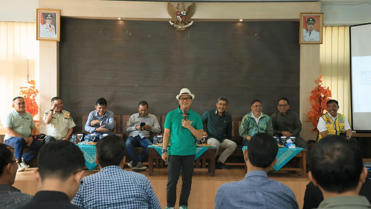 Suasana rapat koordinasi Forum Pentahelix penanganan banjir Sungai Cisunggalah di Aula Kecamatan Solokanjeruk, Sabtu (18/4/2026).