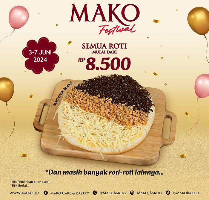 Promo ini berlaku tanggal 3 – 7 Juni 2024 di outlet MAKO Cake and Bakery di seluruh Indonesia. Harga akan menyesuaikan untuk wilayah Ambon dan Papua.