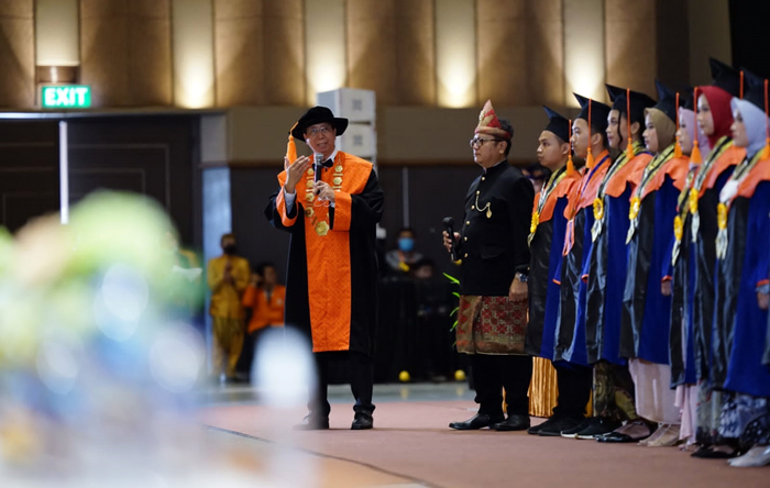 “Kepada wisudawan/wisudawati yang saya banggakan, tetaplah belajar sepanjang hayat, tetap optimis dan selalu bekerja keras dalam menempuh kampus kehidupan. Serta menjadi insan yang berbudi pekerti luhur, santun dalam perkataan dan perbuatan, selalu rendah hati dan juga menghormati sesama,” tuturnya.